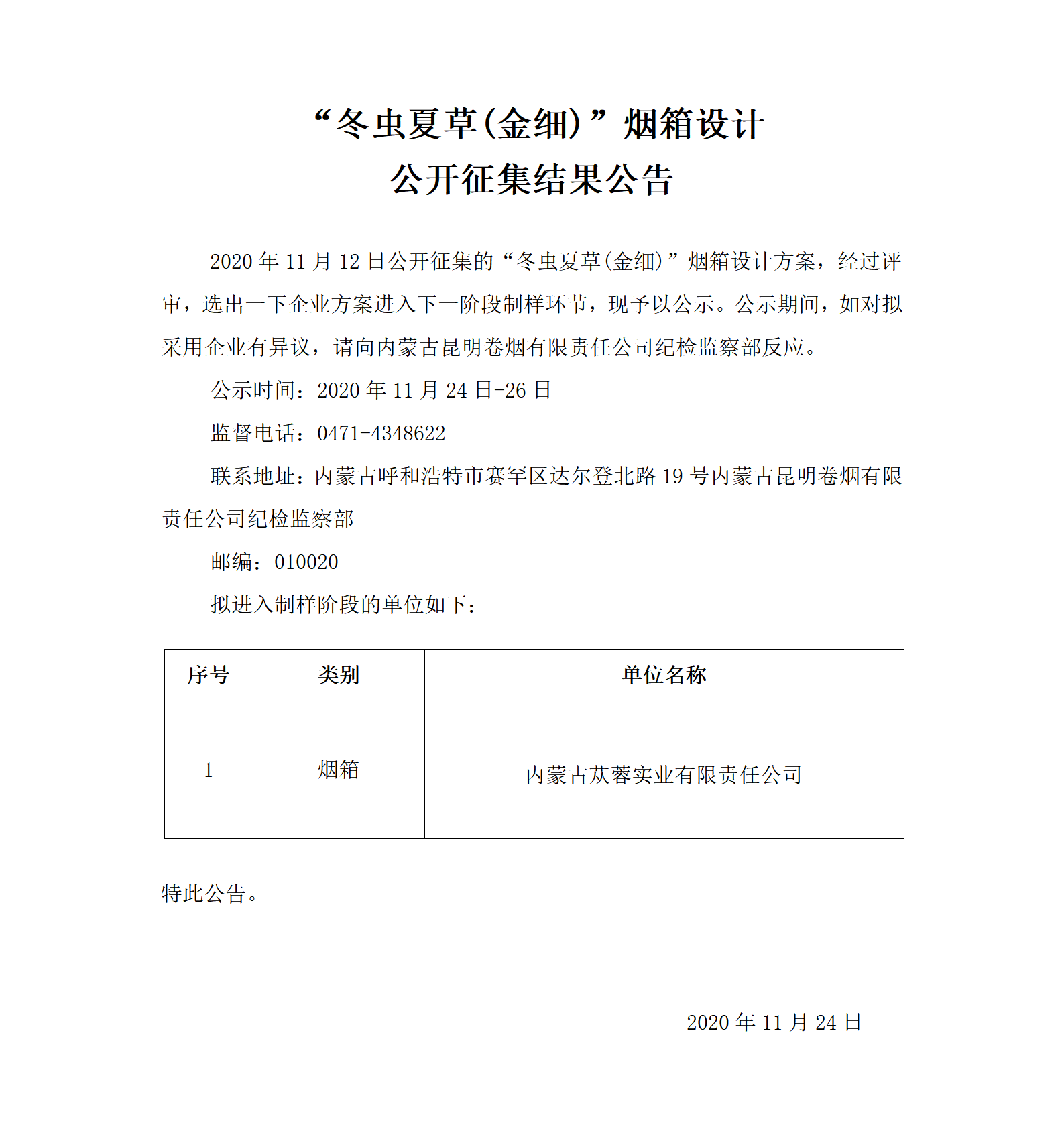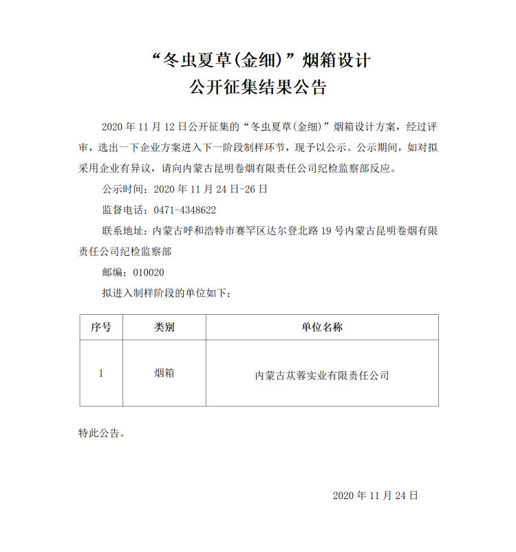 “冬蟲夏草(金細)”煙箱設計公開征集結果公告