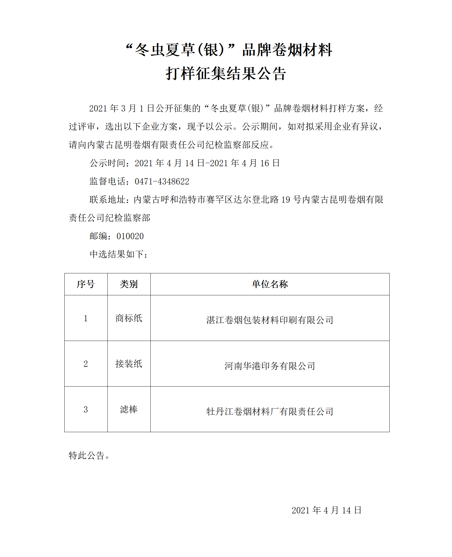 “冬蟲夏草(銀)”品牌卷煙材料設計打樣征集結果公告