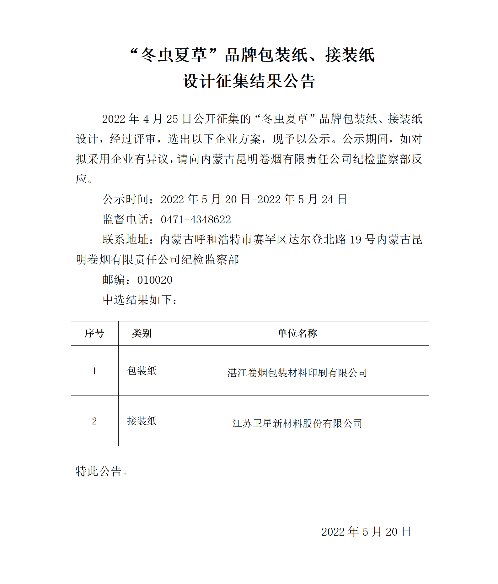 “冬蟲夏草”品牌包裝紙、接裝紙設計征集結果公告